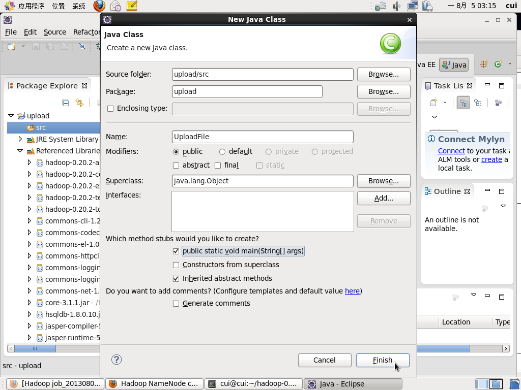 第一步:首先搭建java的編譯環境。創建一個Java Project工程,名為upload。