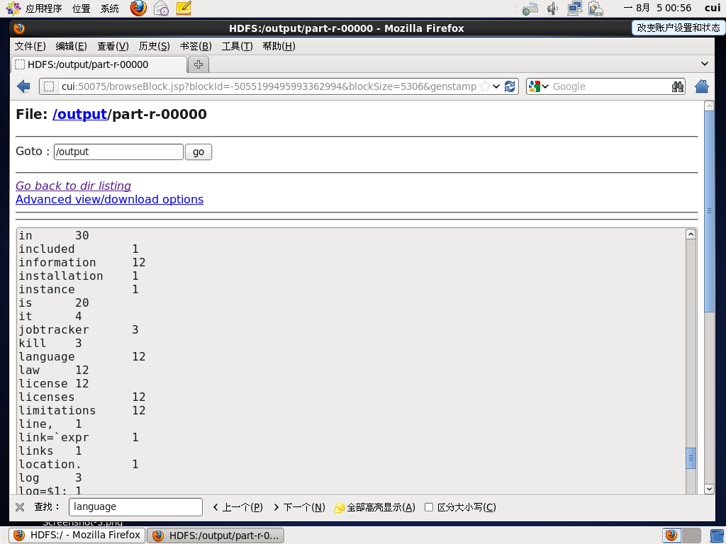 第五步:驗證結果是否正確。通過命令統計某一單詞的個數,與MapReduce統計的個數進行對比。