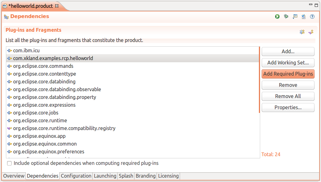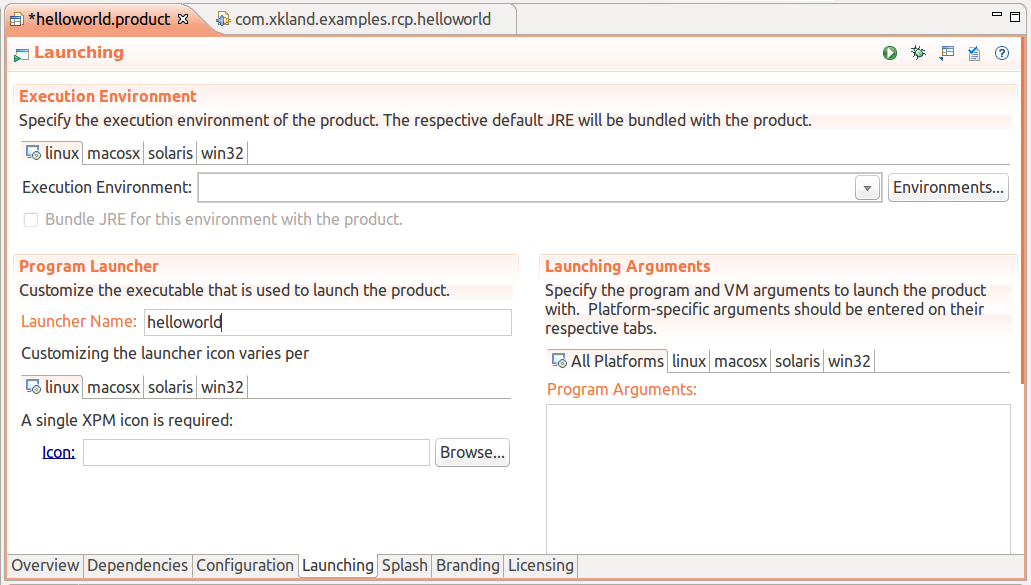 到現(xiàn)在,我們的工作完成一半,因?yàn)樵摮绦蜻€只能在Eclipse中運(yùn)行,要想脫離Eclipse單獨(dú)運(yùn)行,必須將其作為單獨(dú)的產(chǎn)品導(dǎo)出。要導(dǎo)出產(chǎn)品,先要新建一個(gè)product configuration,然后進(jìn)行配置。為簡(jiǎn)單起見(jiàn),我們只需要配置三個(gè)地方。