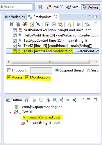 這是一個(gè)非常好的功能,當(dāng)選定的屬性訪問(wèn)或修改程序時(shí),程序會(huì)停止執(zhí)行并允許進(jìn)行調(diào)試。在Outline視圖中選擇一個(gè)類變量并從上下文菜單中選擇切換監(jiān)視點(diǎn),屬性監(jiān)視點(diǎn)將會(huì)被創(chuàng)建,在斷點(diǎn)(Breakpoints)視圖中會(huì)把所有監(jiān)視點(diǎn)用列表的形式顯示出來(lái)。