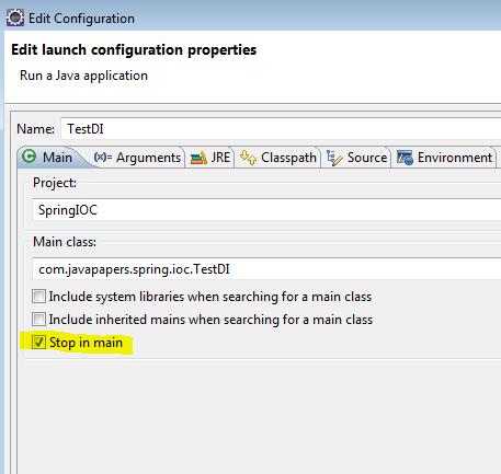 在運(yùn)行/調(diào)試設(shè)置中,編輯配置對(duì)話框中有“Main”這個(gè)選項(xiàng)卡,我們可以勾選“Stop in main”這個(gè)復(fù)選框。如果選中,那么在調(diào)試一個(gè)基于main方法的Java程序時(shí),程序會(huì)在main方法第一行位置便停止執(zhí)行。