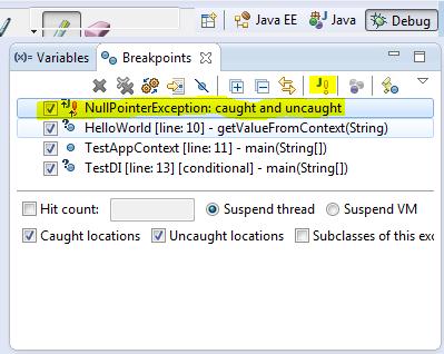 在斷點(diǎn)視圖中,有一個(gè)J!標(biāo)記按鈕!我們可以使用該按鈕來(lái)添加一個(gè)Java異常斷點(diǎn)。例如,我們想讓程序在遇到空指針異常(NullPointerException)時(shí),仍然能繼續(xù)調(diào)試,那么我們可以使用該按鈕來(lái)添加一個(gè)異常斷點(diǎn)!