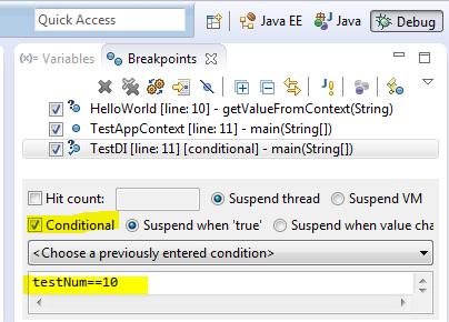 如果你不知道如何添加斷點(diǎn),只需點(diǎn)擊左邊面板(行號(hào)前面)斷點(diǎn)即被創(chuàng)建。在調(diào)試界面中,“斷點(diǎn)”視圖會(huì)把所有被創(chuàng)建的斷點(diǎn)列出來(lái)。我們可以給它加一個(gè)布爾條件,也就是說(shuō),該斷點(diǎn)會(huì)被激活并且如果布爾條件為真,就會(huì)執(zhí)行該斷點(diǎn),否則將會(huì)跳過(guò)往下執(zhí)行。