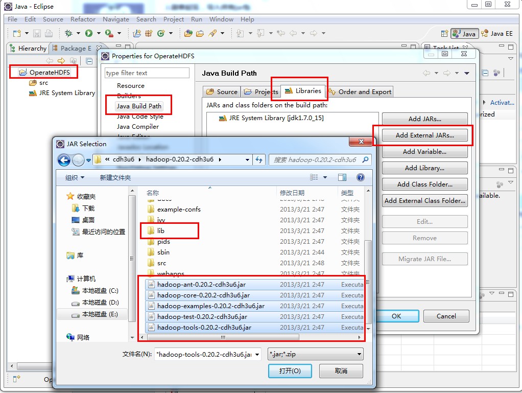 5、到上面的畫面后,下面就是選擇開發hadoop程序時,用到的一些jar包