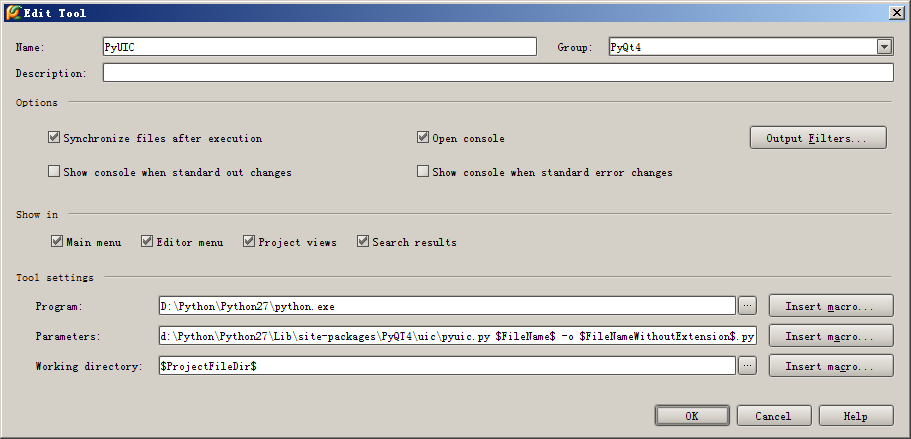 Work directory 使用變量 $ProjectFileDir$ (點擊后面的 Insert macro 按鈕可以不用輸入雙擊上屏)