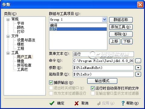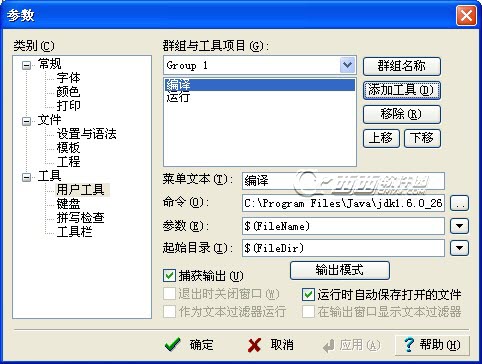 3、首先配置【編譯】功能,按照上圖所示,菜單文本為編譯,命令為javac.exe的路徑,勾選【捕獲輸出】。