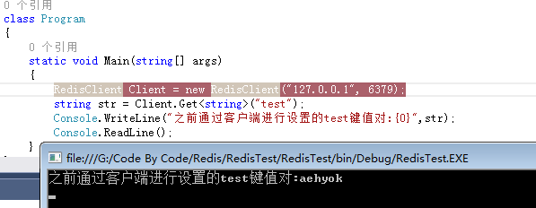 RedisClient Client = new RedisClient("127.0.0.1", 6379); string str = Client.Get<string>("test"); Console.WriteLine("之前通過客戶端進(jìn)行設(shè)置的test鍵值對:{0}",str); Console.ReadLine();