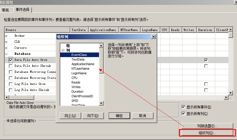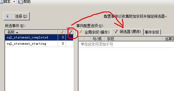 在這里我們?yōu)閟ql_statement_starting和sql_statement_completed事件,在全局字段(操作)里選擇database_name