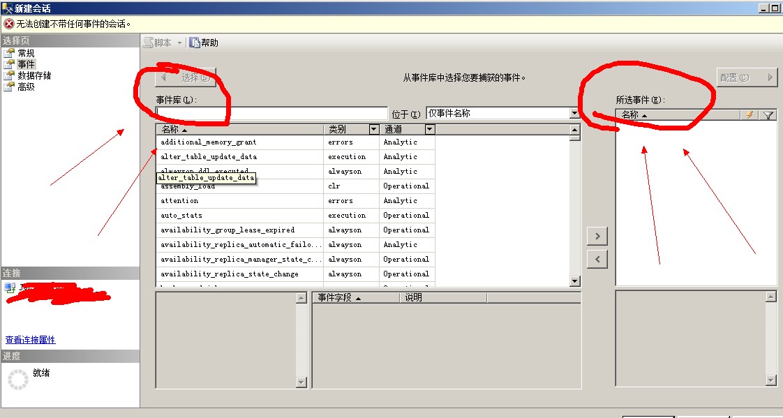 事件頁面是最復(fù)雜的,你首先看到它分為左右兩部分,左邊是事件庫,所有在SQL Server里注冊的擴展事件都列在這里,右邊是你選擇的事件。