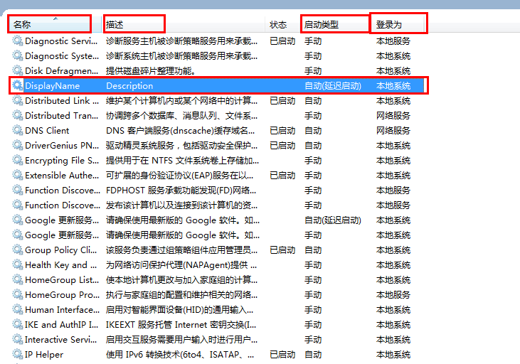 從下圖服務(wù)列表可以看出名稱對應(yīng)DisplayName,描述對應(yīng)Description,啟動類型對應(yīng)StartType,登錄為對應(yīng)Account(serviceProcessInstaller)。