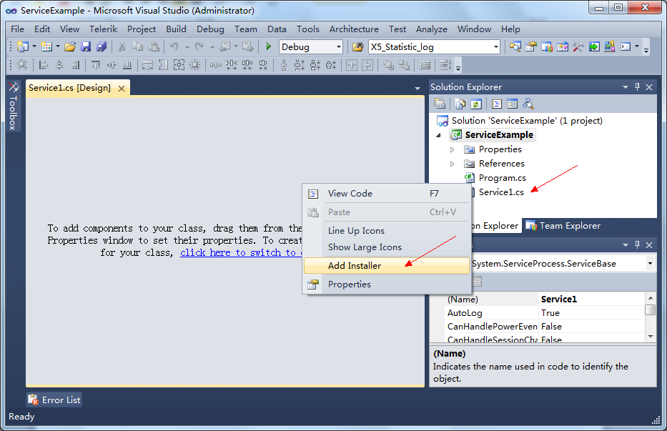 創(chuàng)建好項目之后,在生成的Service1.cs的設(shè)計頁面右鍵選擇Add Installer,會生成一個ProjectInstaller.cs。這個文件中有兩個組件:serviceProcessInstaller和serviceInstaller。