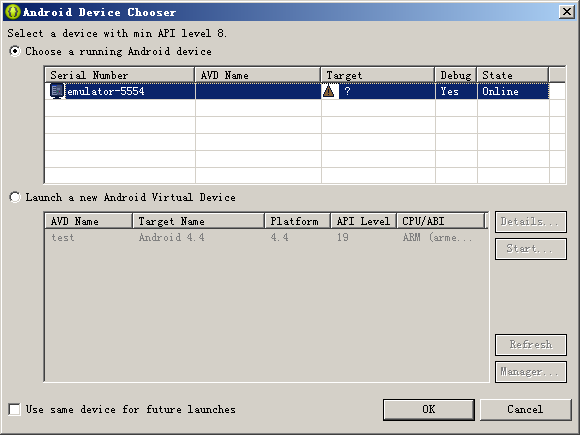 選擇第一個 :OK,這是會彈出一個選擇模擬器的對話框,(記得要提前把模擬器啟動起來,不要關閉)