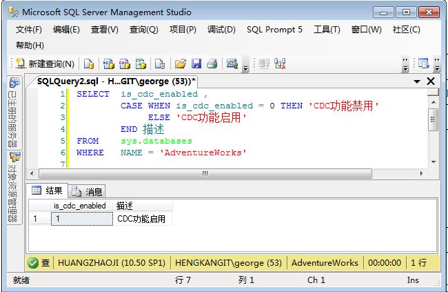 </p><p>SELECT is_cdc_enabled,CASEWHENis_cdc_enabled=0THEN'CDC功能禁用'ELSE'CDC功能啟用'END描述</p><p>FROM sys.databases</p><p>WHERE NAME = 'AdventureWorks'