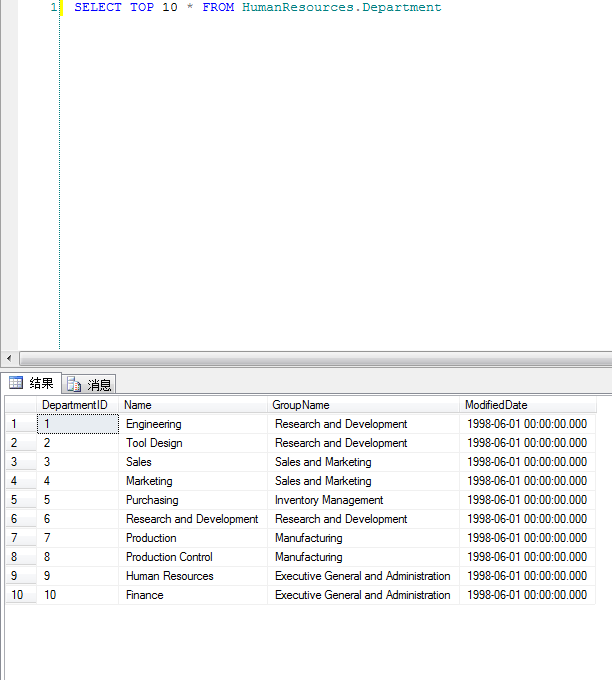 </p><p align="left">INSERT INTOHumanResources.Department(name,GroupName,ModifiedDate)</p><p align="left">VALUES('test','abc',GETDATE())</p><p align="left">INSERT INTOHumanResources.Department(name,GroupName,ModifiedDate)</p><p align="left">VALUES('test1','abc1',GETDATE())</p><p align="left">go</p><p align="left">