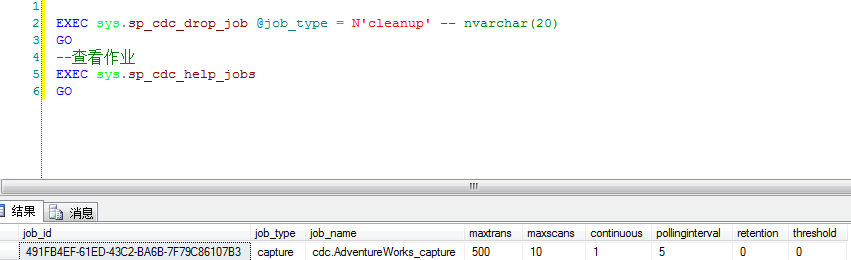 </p><p align="left">EXEC sys.sp_cdc_drop_job@job_type= N'cleanup' -- nvarchar(20)</p><p align="left">GO</p><p align="left">--查看作業(yè)</p><p align="left">EXEC sys.sp_cdc_help_jobs</p><p>GO</p><p>