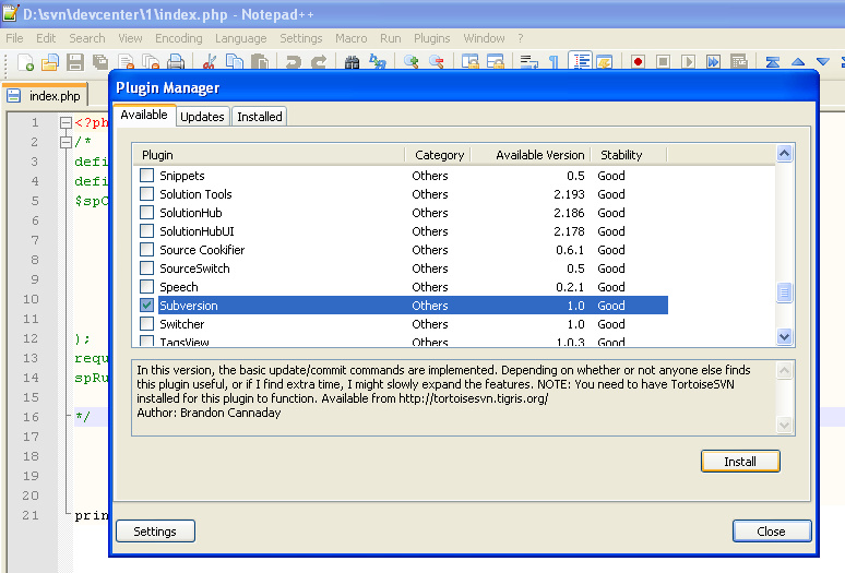打開后,在“Available”頁找到“Subversion”,然后點擊“Install”,如圖13所示: