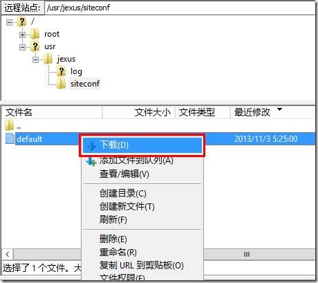 連接后,將/usr/jexus/siteconf/default 文件復制一份到本地