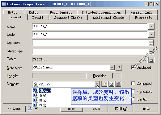 域和數(shù)據(jù)項的作用是為了復(fù)用而設(shè)定的,數(shù)據(jù)類型可以保持一致,比如不少表里都有經(jīng)緯度,則可以定義兩個通用的域,如圖所示,點擊【Model】-【Domains】 出現(xiàn)如圖所示,建了三個域,那么建表時可以復(fù)用,打開列的屬性的時候就可以復(fù)用了,如果域的類型發(fā)生了改變,則該列的數(shù)據(jù)類型也發(fā)生改變。數(shù)據(jù)項作用類似于此。還有一些,比如主鍵遞增ID