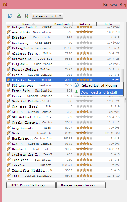 在彈出的“Browse repositories”對(duì)話框中右鍵選擇“File Watchers”,在右鍵菜單中選擇“Download and Install”,關(guān)閉當(dāng)前對(duì)話框。
