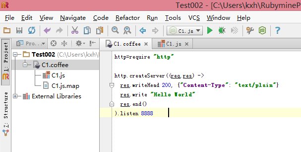 注意:一旦修改了C1.coffee代碼,就會(huì)生成其對(duì)應(yīng)的js文件,用這個(gè)js文件作為執(zhí)行對(duì)象即可。