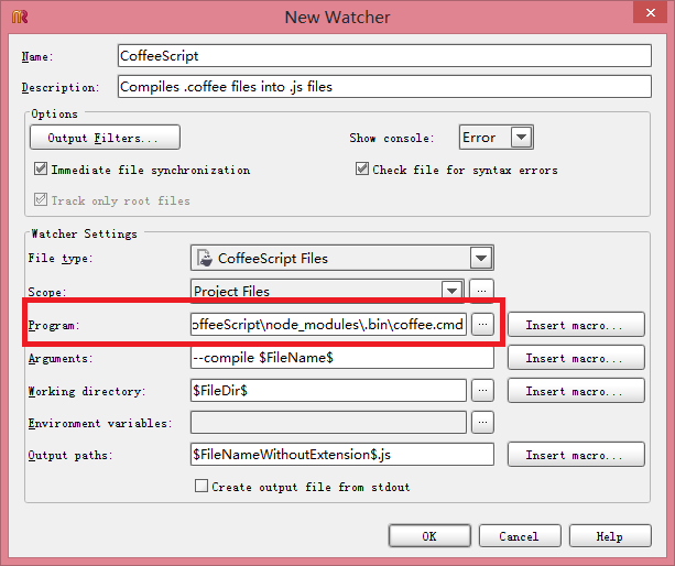 同樣,在“New Watcher”對(duì)話框中,只要設(shè)置“Program”項(xiàng),該項(xiàng)的值是上面第三步中安裝coffee-script-redux后產(chǎn)生的Coffee.cmd的路徑。