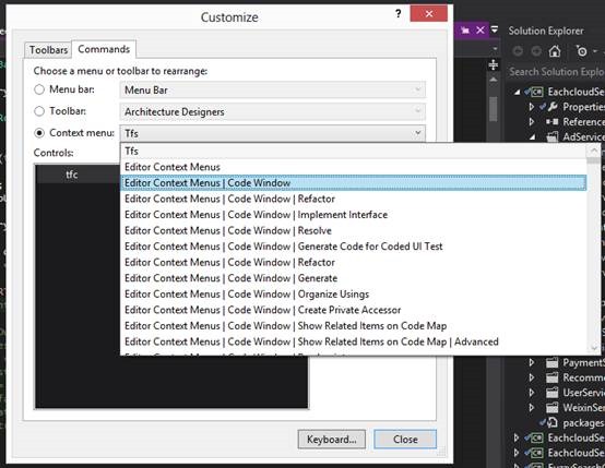 2. 在彈出窗口中選擇Commands選項卡,并選擇Context menus,在下拉菜單中選擇Editor Context Menus | Code Windows: