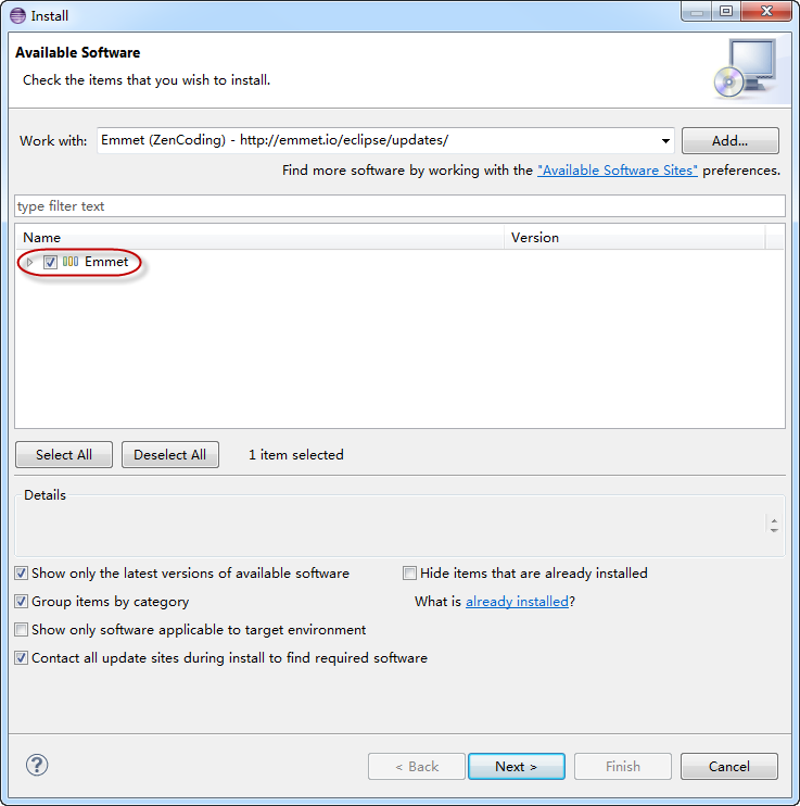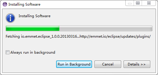 當 Install 對話框中顯示出了 Emmet 選擇項后,選擇 Emmet,一路 Next,到最后一步,選擇 I accept the terms of th license agreements,單擊 Finish,彈出下載對話框,開始下載必要的組件: