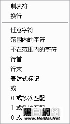 2.單擊“查找內容”組合框右側的按鈕 ,出現下拉菜單,如下圖所示。菜單命令中,本文用得著的命令依次是:制表符、換行、范圍內的字符、行首、0或多次匹配。