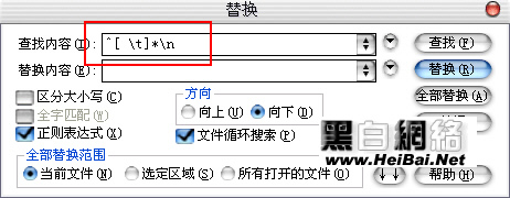 下面的操作添加正則表達式,該表達式代表待查找的空行。(技巧提示:空行僅包括空格符、制表符、回車符,且必須以這三個符號之一作為一行的開頭,并且以回車符結尾,查找空行的關鍵是構造代表空行的正則表達式)。