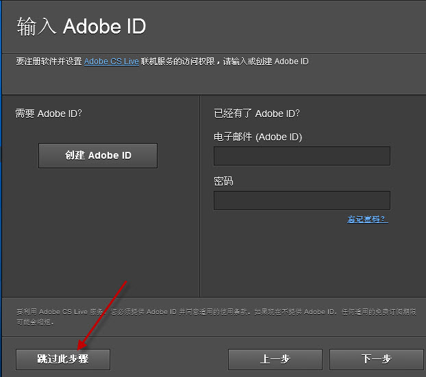 6、點擊下一步,會要求輸入adobe ID,不用管它,直接選擇“跳過此步驟”