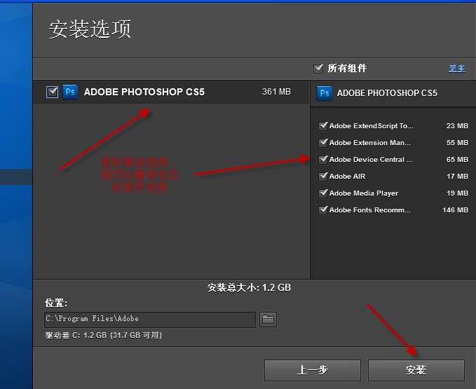 7、選擇你需要安裝的組件,單擊“安裝”開始進行安裝: