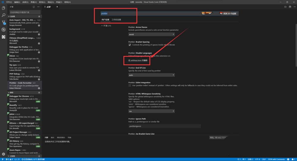 3、在搜索條搜索prettier,點擊 在settings中編輯