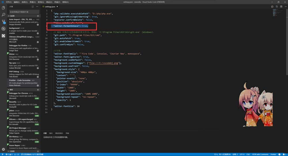 4、添加一條保存時格式化代碼的語句,"editor.formatOnSave": true