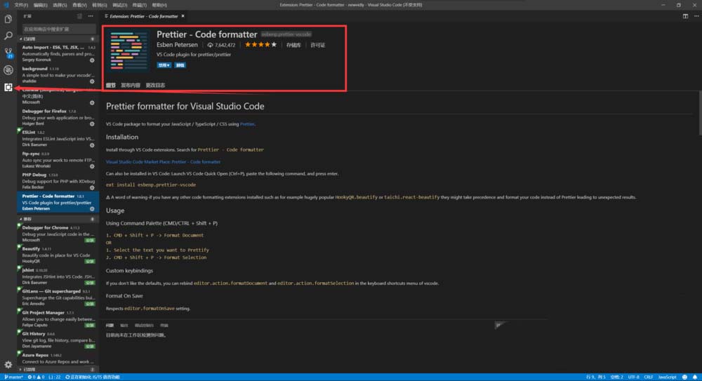 1、首先在code中安裝 Prettier -Code formatter[代碼格式化程序]