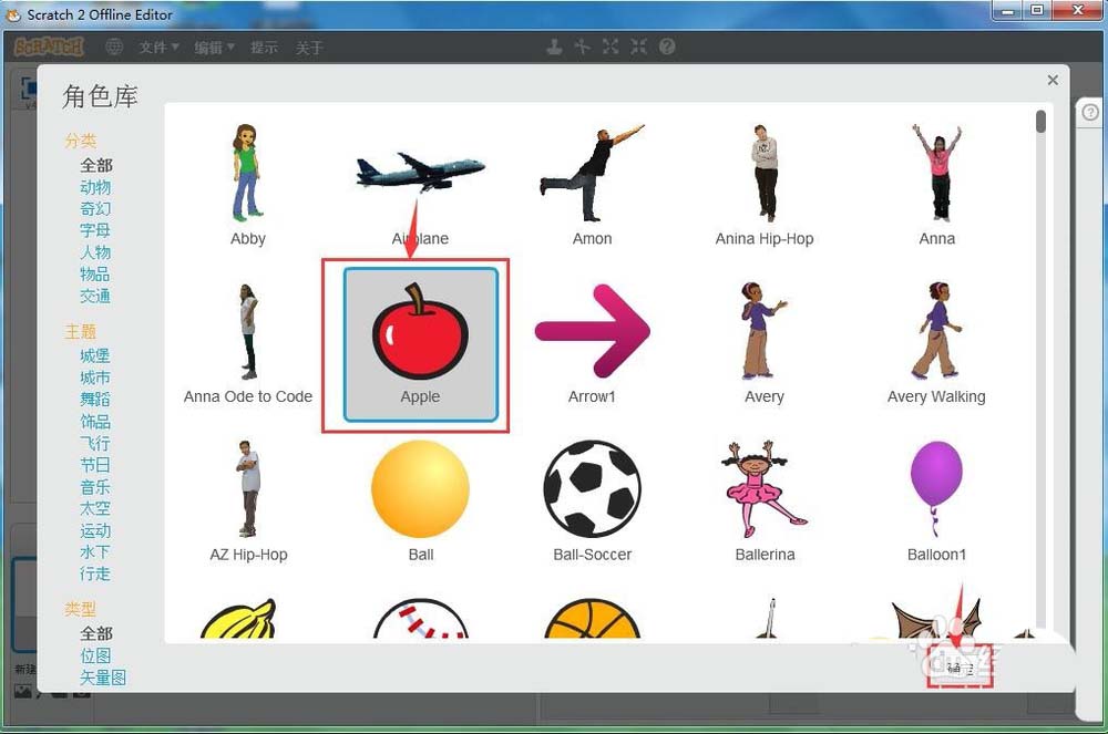 4、在角色庫(kù)中找到并選中蘋果,點(diǎn)擊確定;