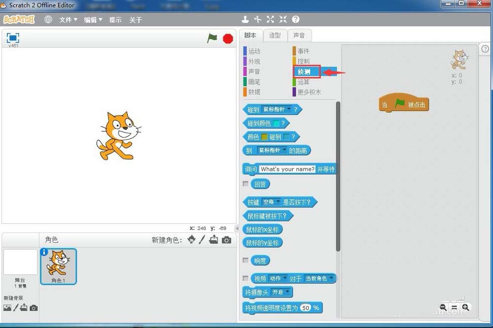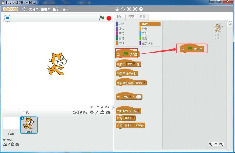 3、將當綠旗被點擊拉到右邊的腳本編輯區中;