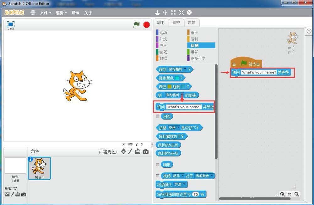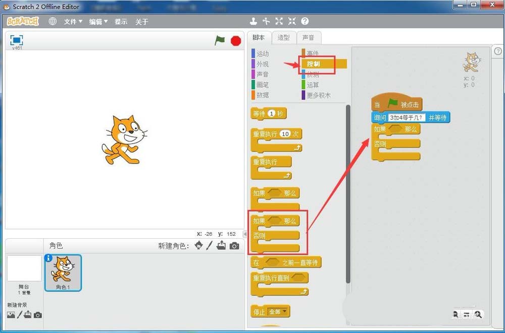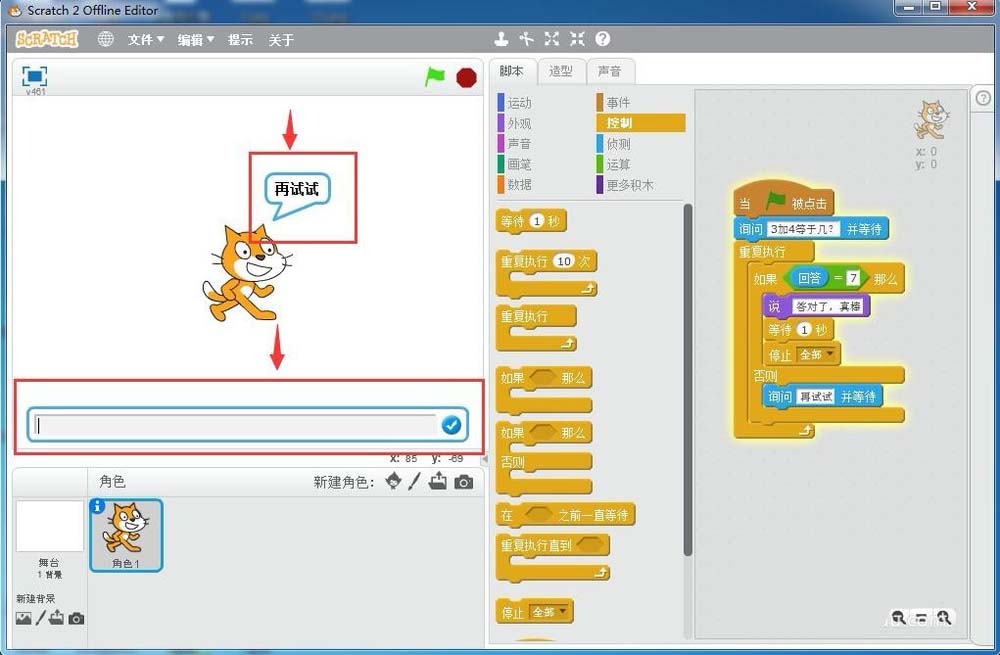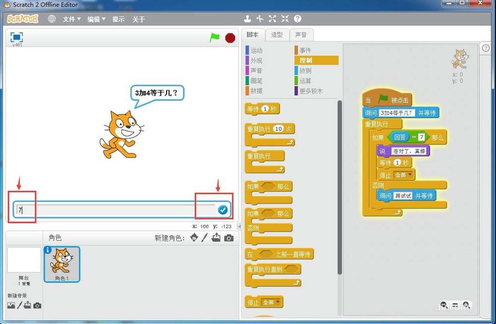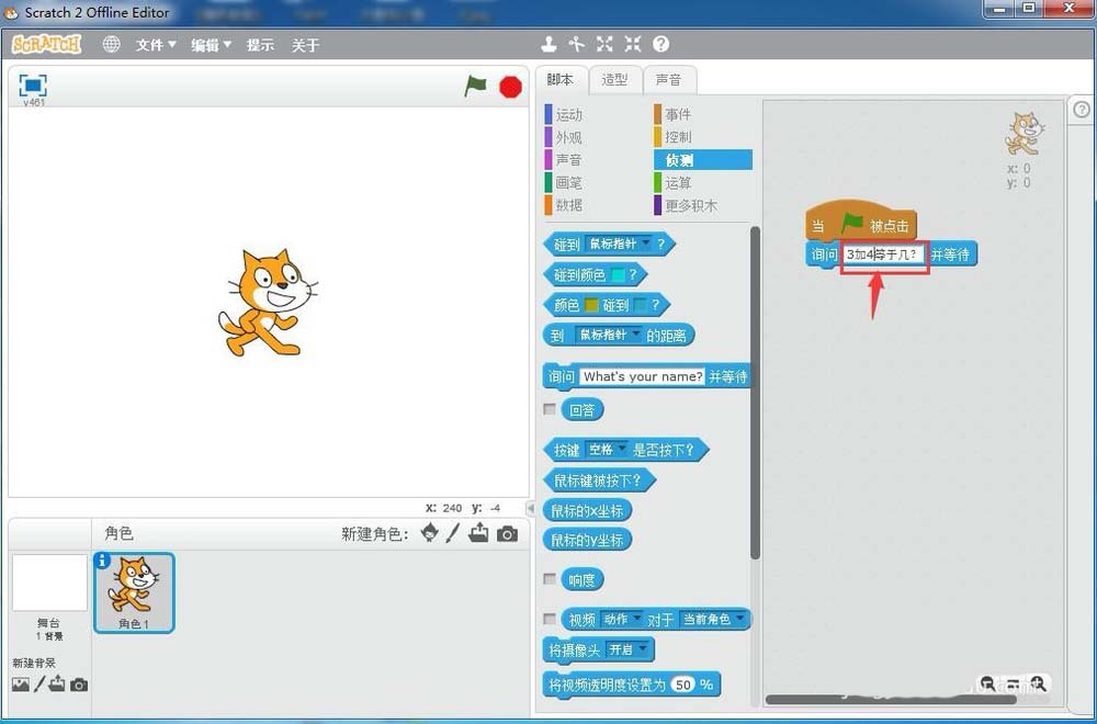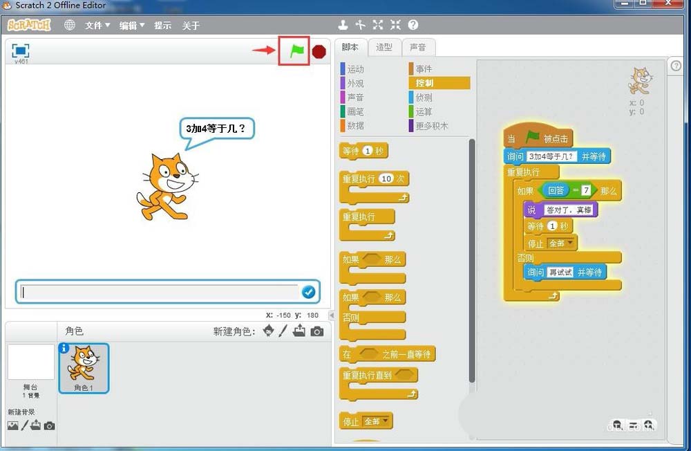 9、點擊綠旗執行程序,開始出題3加4等于幾,下面出現一個答題響應框;