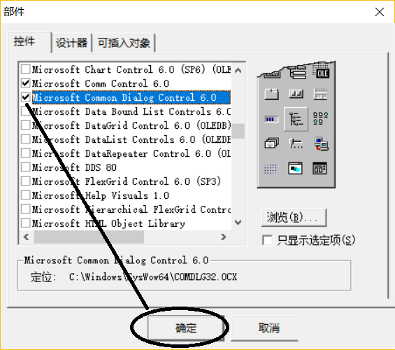 2、點(diǎn)擊“部件”對(duì)話框的“控件”頁(yè),找到“Microsoft Common Dialog Control 6.0”,勾選,點(diǎn)擊“確定”。