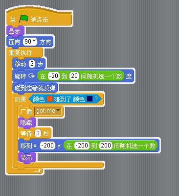 3、給小魚編程,讓小魚到處隨機(jī)移動(dòng)并且碰到大魚的嘴巴就消失,(要在大魚的嘴巴上畫一些顏色)。
