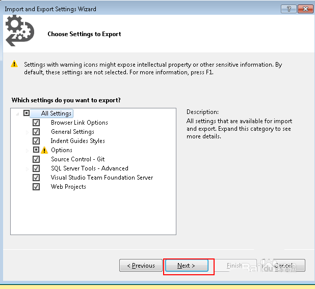 3、然后選擇需要導(dǎo)出的配置,可以全選,如圖,點(diǎn)擊“next”