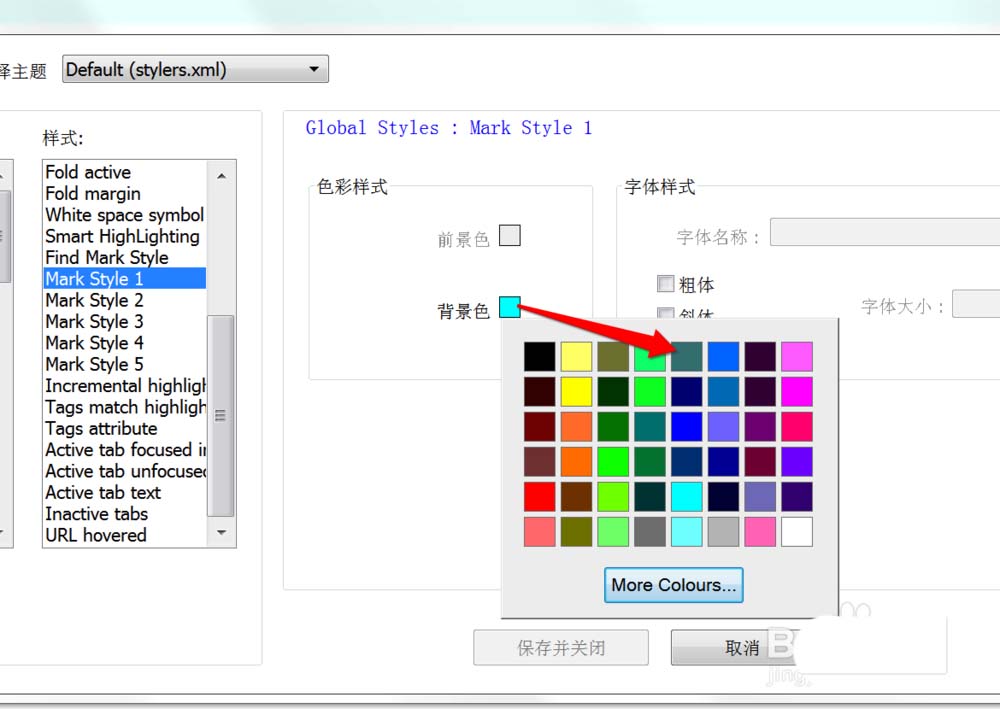 5、單擊下圖中的顏色塊,可以更改默認樣式的顏色,如下我們給【Mark Style1】換了一種顏色方案,則給選中文本設置【使用樣式1】時就會變成我們更改后的顏色了。
