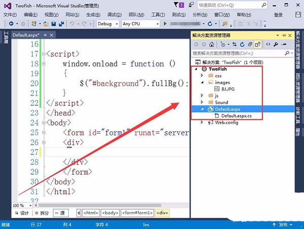 1、首先,Visual Studio打開一個網(wǎng)站,本例為TwoFish,在網(wǎng)站中已放置了圖片資源,以及需使用的css樣式和js代碼。