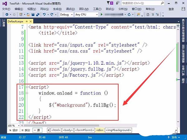 10、最后,用script標簽引用一個函數(shù),實現(xiàn)將圖片設(shè)置為全屏的背景。