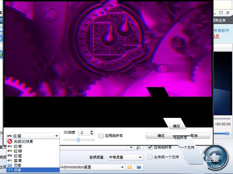 3、在3d設置對話框中,設置效果為并排,在上面畫面中可以預覽效果。