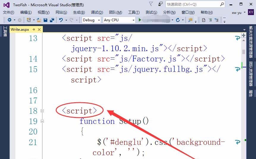1、用Visual Studio打開一個網頁,找到script標簽。
