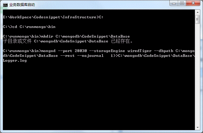 C:cd C:/runmongo/binmkdir C:/mongodb/CodeSnippet/DataBasemongod --port 28030 --storageEngine wiredTiger --dbpath C:/mongodb/CodeSnippet/DataBase --rest --nojournal >> C:/mongodb/CodeSnippet/DataBase/Logger.log