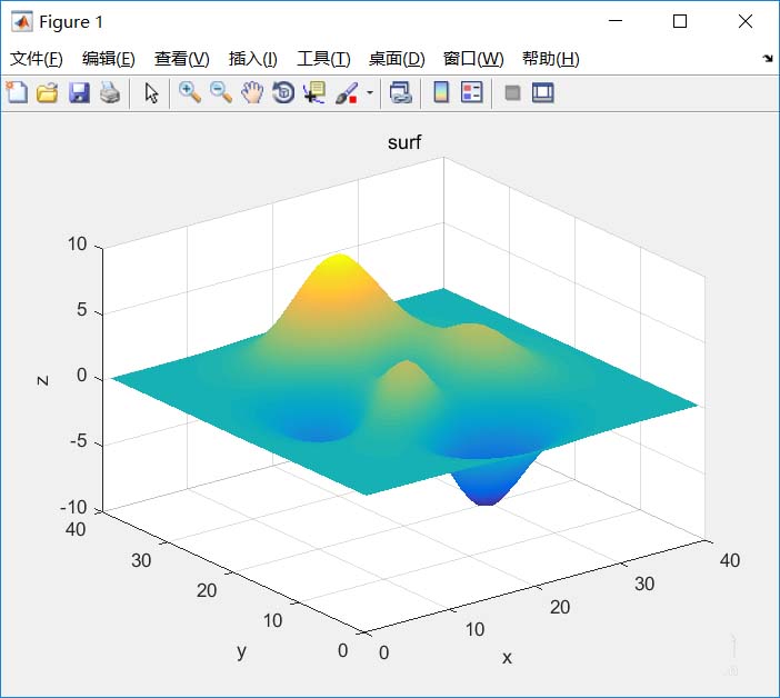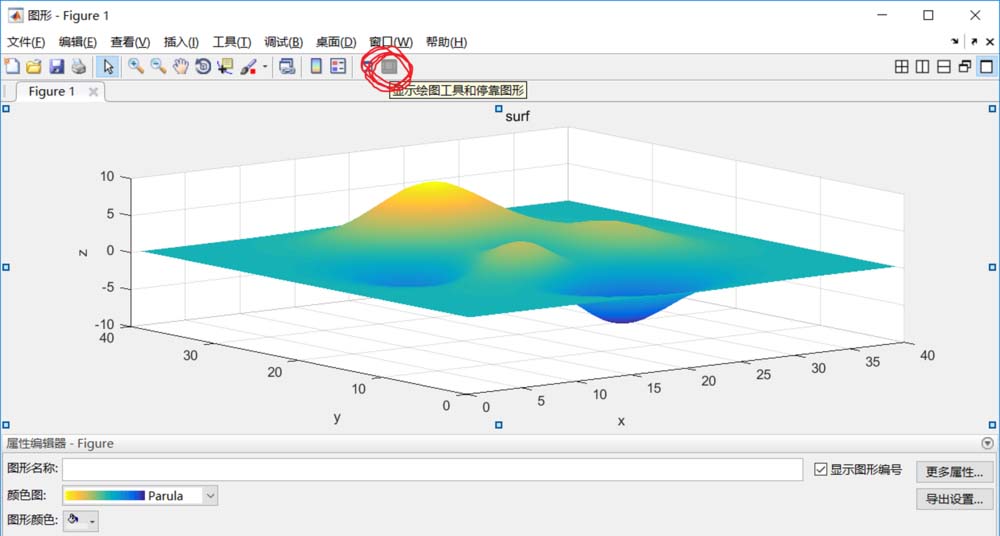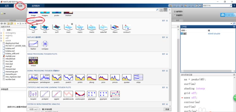 2、在Matlab左上角,打開“繪圖”——“MATLAB三維曲面圖”,自行選擇圖形類型。這里我們選擇最常用的第一個類型命令為“surf”,生成如下圖形。