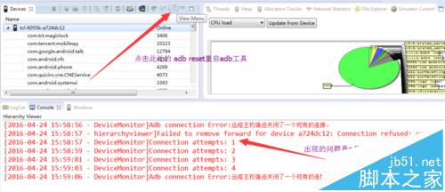 [2016-04-24 15:58:56 - DeviceMonitor]Adb connection Error:遠程主機強迫關閉了一個現有的連接。[2016-04-24 15:58:57 - hierarchyviewer]Failed to remove forward for device a724dc12: Connection refused: connect[2016-04-24 15:58:57 - DeviceMonitor]Connection attempts: 1[2016-04-24 15:58:59 - DeviceMonitor]Connection attempts: 2[2016-04-24 15:59:01 - DeviceMonitor]Connection attempts: 3[2016-04-24 15:59:03 - DeviceMonitor]Connection attempts: 4[2016-04-24 15:59:06 - DeviceMonitor]Adb connection Error:遠程主機強迫關閉了一個現有的連接。