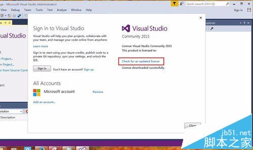 7、完成后點擊右邊的 “Check for an updated liense”等待一會兒,免費的vs就又回來了。