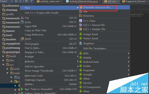 1、找到需要新建xml 的module 下的drawable文件,在此目錄下右擊drawable,選擇Drawable resource file,具體路徑為app-->src-->res-->drawable,右擊操作順序為 New-->Drawable resource file